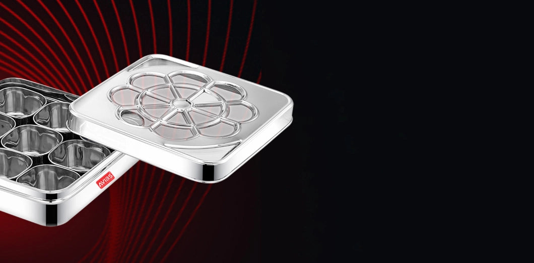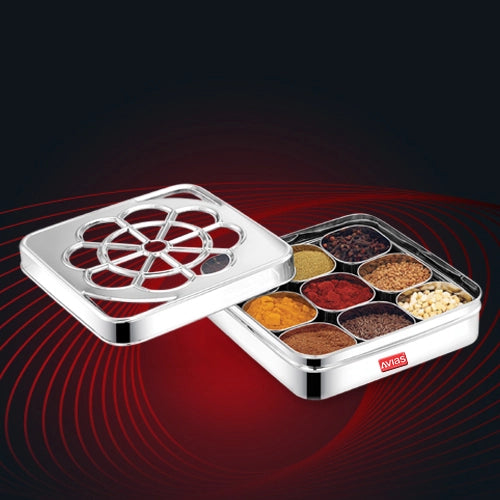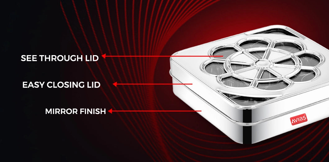 The Avias Flora Spice box with square containers is a multipurpose container that can be used to store spices, dry fruits, or mouth fresheners. The spice box is made of high-quality food-grade stainless steel that is rust-resistant and has a mirror finish polish.