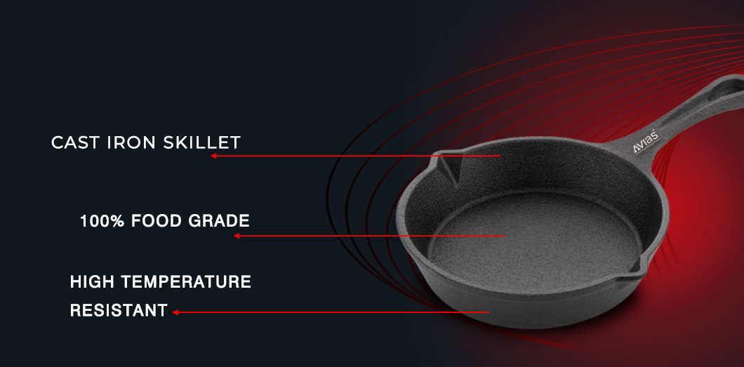 The Avias Premium Cast Iron Skillet / Iron Fry Pan is entirely natural, free from any toxic coatings. The Best Cast iron cookware, in fact, imparts beneficial iron content to the food, making it a healthier choice compared to non-stick pans.
